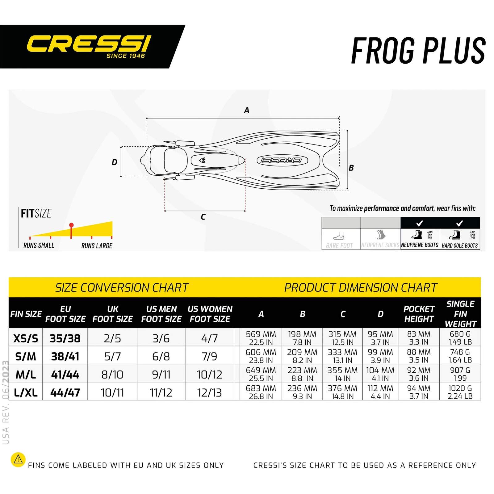 The Cressi Frog Plus diving fins are perfect for a broad range of divers, from recreational to advanced users seeking an efficient and comfortable diving experience. Ideal for deep-sea diving, reef snorkeling, and exploration in various water conditions, they perform effectively in calm waters as well as moderate currents. Pairing the fins with neoprene booties is recommended for optimal comfort and fit, enhancing your overall diving experience.