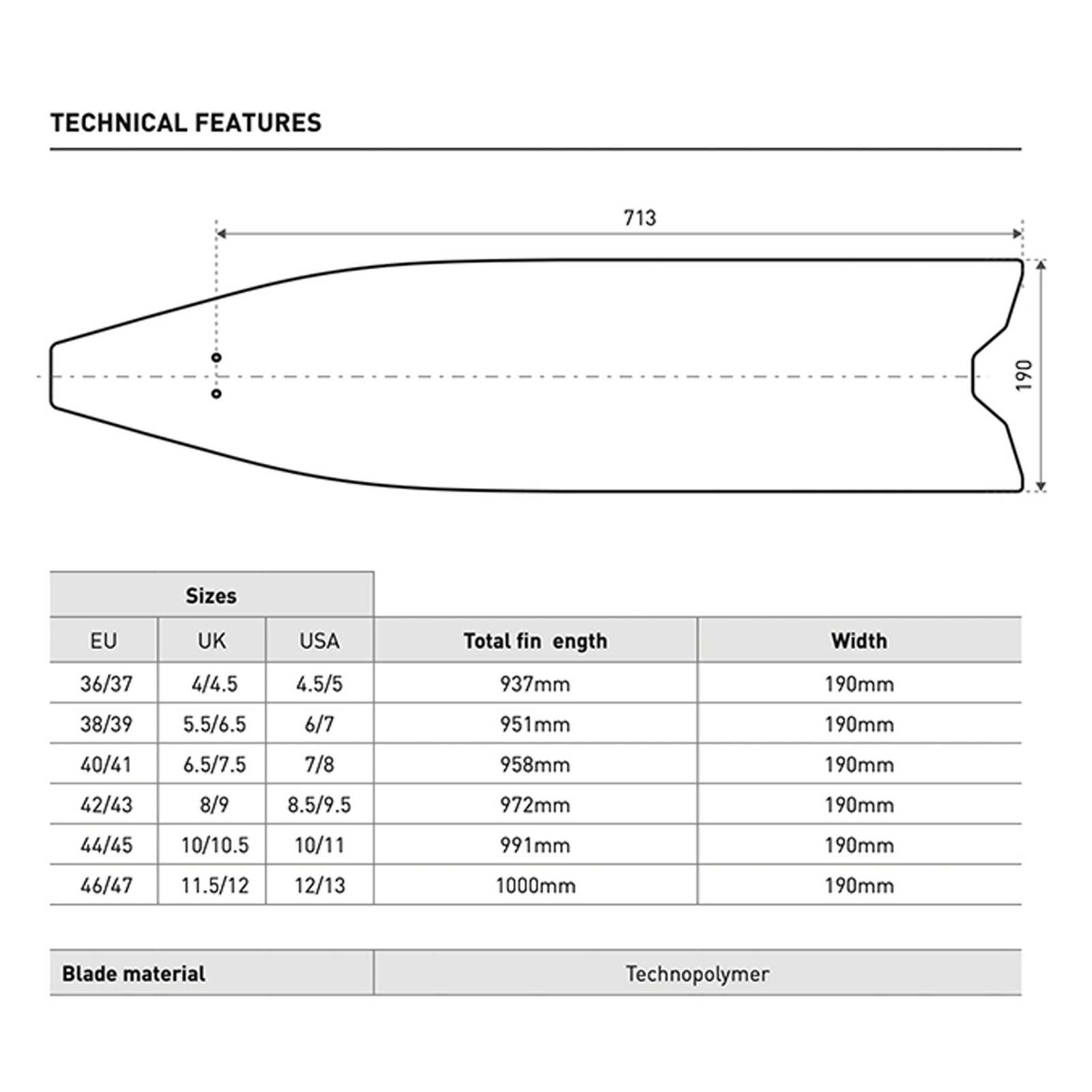 - V-förmige Blattspitze zur Stabilisierung des Kicks und zur Verringerung seitlichen Wasserreibens
