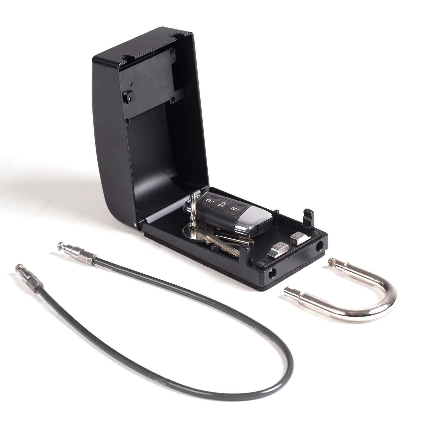 Hauptmerkmale: - Widerstandsfähige Vollmetall-Konstruktion, wasserabweisend für den Outdoor-Einsatz - Doppeltes Befestigungssystem: beschichteter Bügel und ummanteltes Stahlkabel für maximale Flexibilität - 4-stelliger Zahlencode mit 10.000 Kombinationen – sicher und schlüssellos - Schaumstoffrücken und beschichteter Bügel schützen Lack und Oberflächen - Großzügiges Innenfach (69 x 107 x 40 mm) – geeignet für alle Schlüsselgrößen inkl. Keyfobs - Inklusive Key-Fob-Blocking-Pouch (Faraday) zum Blockieren von Keyless-Go-/Funk-Signalen - Einfach an Auto, Dachträger, Rädern, Anhänger, Geländern oder Booten zu sichern - Kompakt und tragbar – passt ins Handschuhfach - Für anspruchsvolle Outdoor-Aktivitäten konzipiert